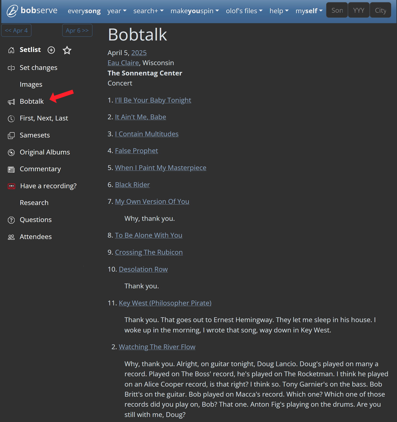 On any setlist, select bobtalk from the side menu. If you’re on mobile, first tap the button to expand the “setlist menu” and then select bobtalk.