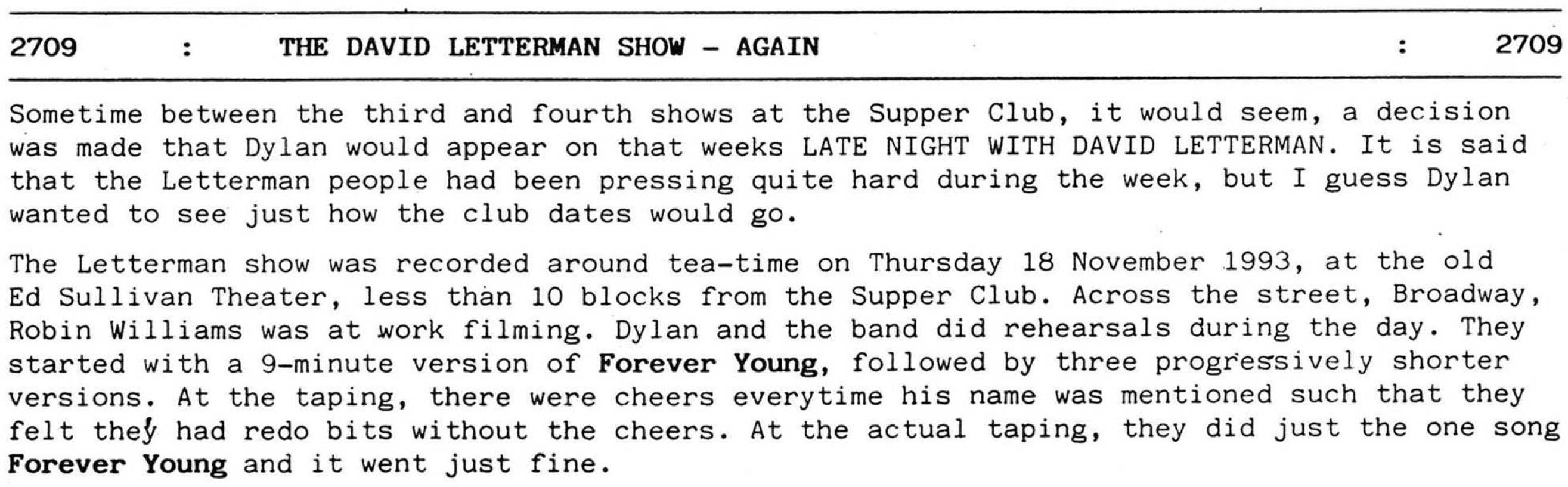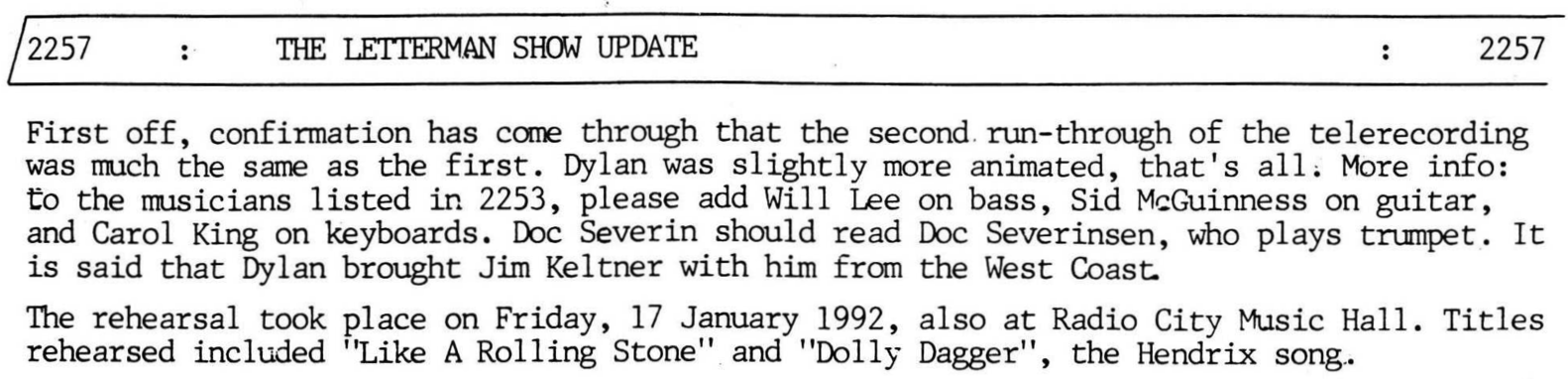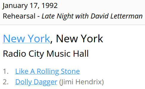 On the Letterman show itself, Dylan performed Like A Rolling Stone. Dolly Dagger, on the other hand, he reserved for a one-time performance in Perth in 1992.