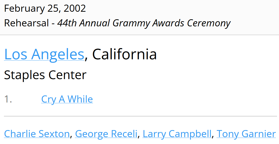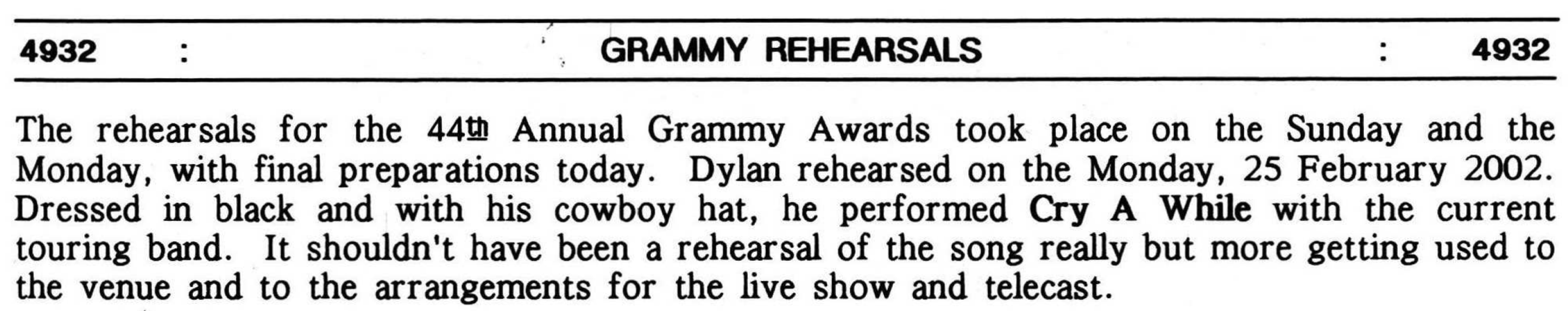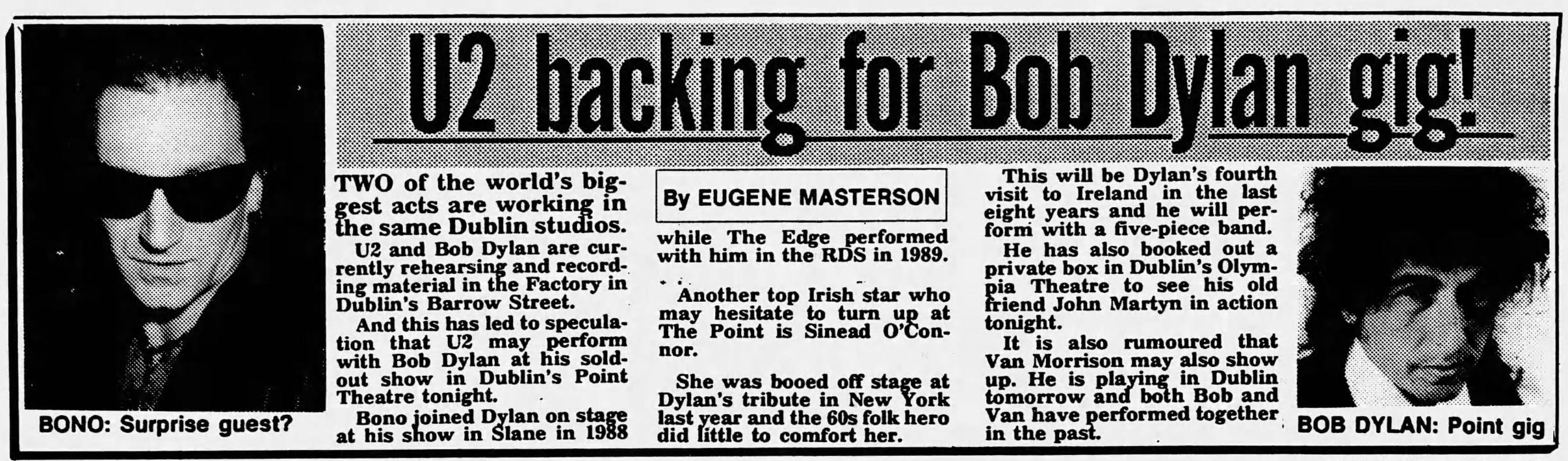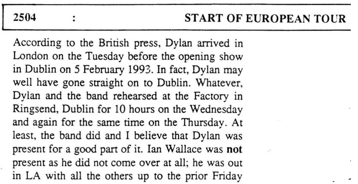 A pair of rehearsals on February 3 and 4, 1993 at The Factory in Ringsend, Dublin. In the band were Bucky Baxter, John Jackson, Tony Garnier, and Winston Watson.