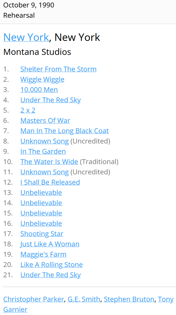 Before resuming the 1990 tour, following almost a one-month break, the band took three consecutive days at the Montana Studios to rehearse. TWM has a setlist for the middle date’s 2-hour session from The Wicked Messenger #641. Of the songs tried out here: