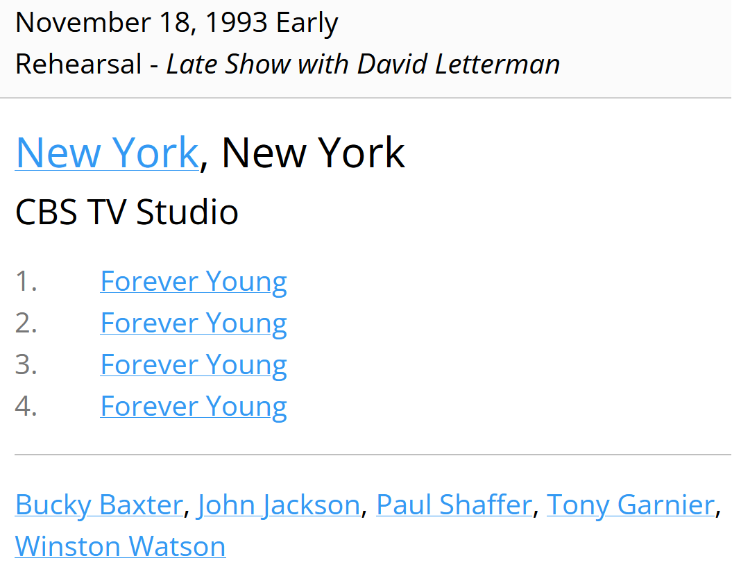 TWM reports this session included a 9-minute Forever Young, in preparation for its TV performance later that day.