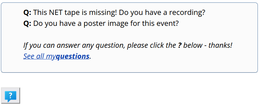 Curious to view all questions? Try the top menu bar, via help/alleventquestions. These will be added to over time. (Although the missing posters/tickets questions aren’t listed here currently, for technical reasons.)