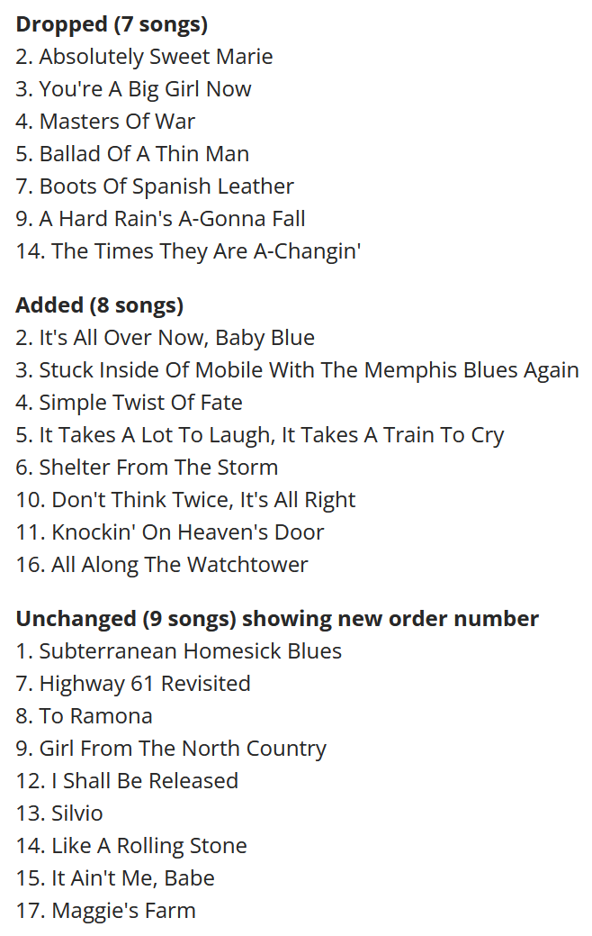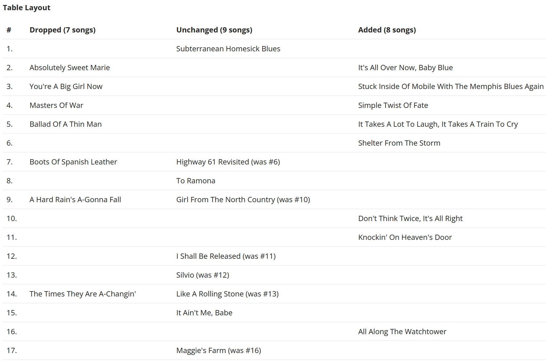 For any concert date at bobserve.com you can now see an analysis of how the setlist compares to the previous concert. Scroll down on any concert setlist page and tap the “changes vs” tab.