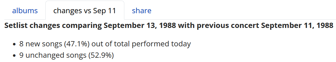 Let’s use as an example September 13, 1988 in Pittsburgh. You’ll find three ways to follow the setlist changes.