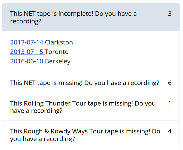 At the top of some setlist pages you’ll find a new questions box, where we might ask if you have missing poster or ticket images, missing recordings, or anything else.